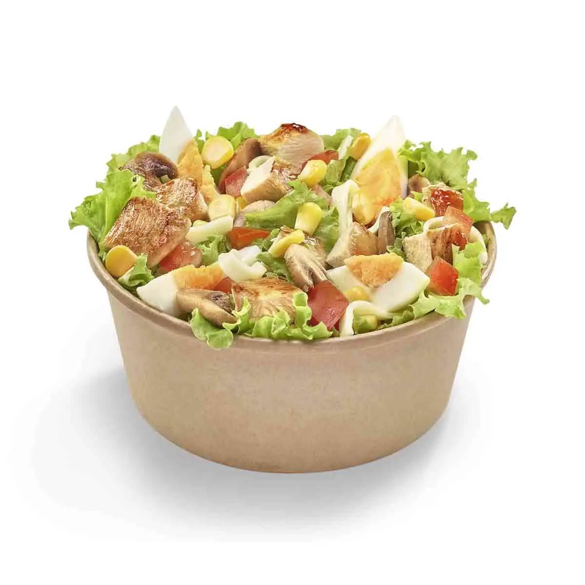 Ensalada con filete de pechuga de pollo en trozos, lechuga crespa, tomate, maíz desgranado, queso mozzarella, champiñones salteados a la plancha, huevo cocido, acompañada de salsa Presto.