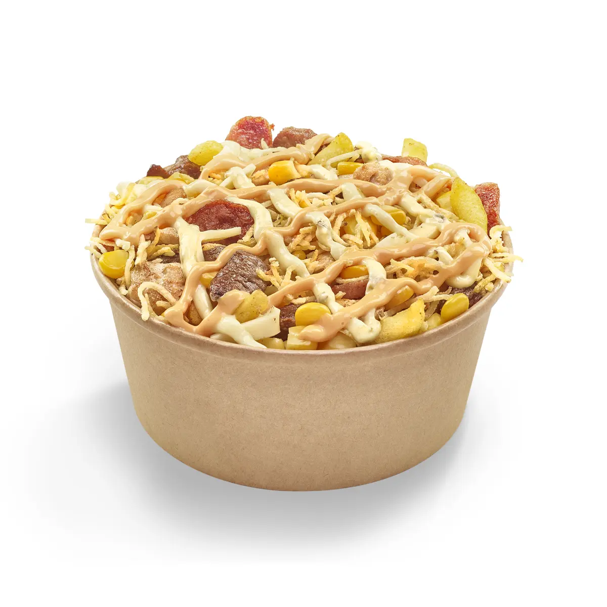 Mazorcada con trozos de pechuga de pollo, lomo de res y salchicha, con maíz desgranado, queso mozzarella, papa a la francesa, papa fosforito, aderezo tipo cheddar y salsa Presto.