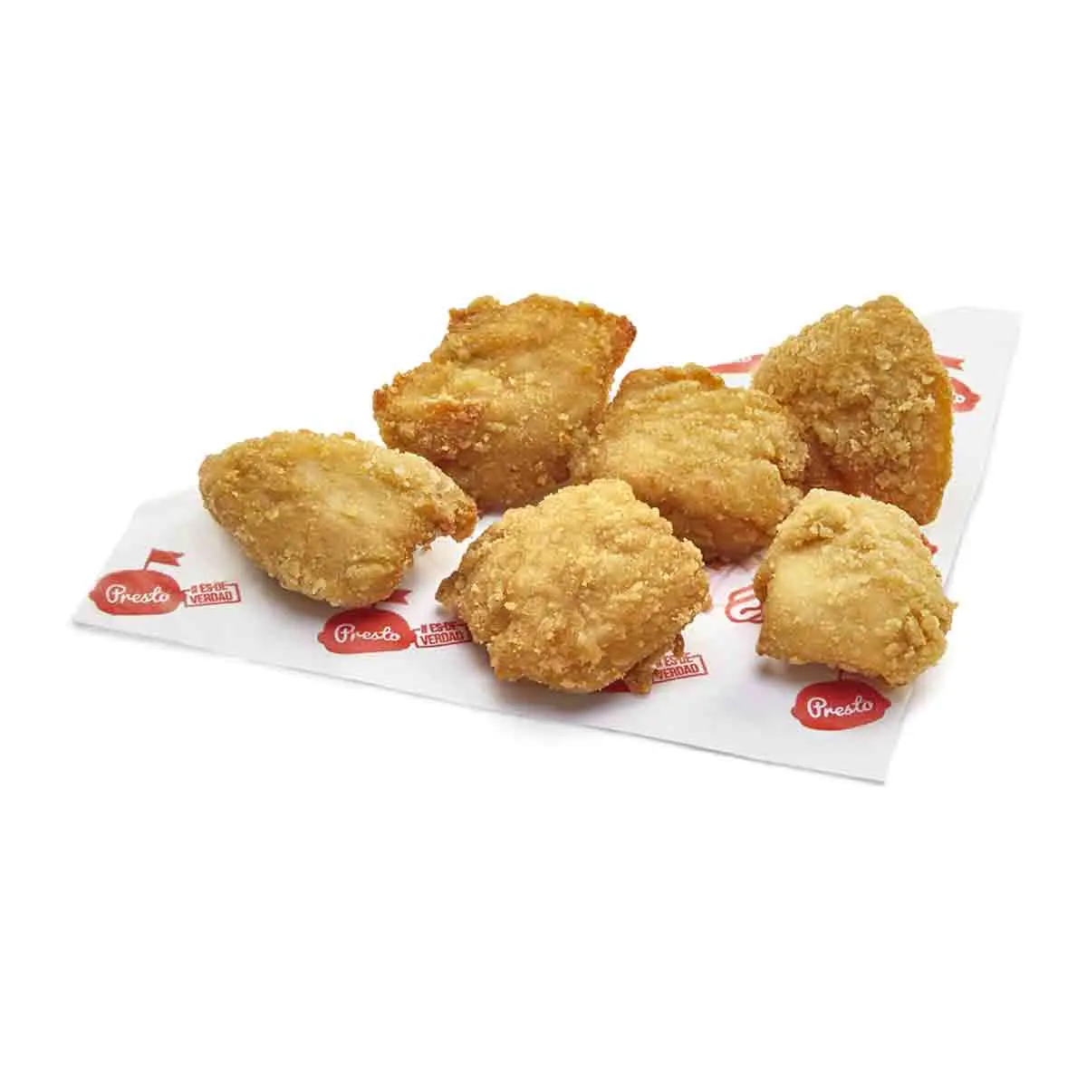 6 nuggets de pechuga de pollo apanados acompañados con miel.