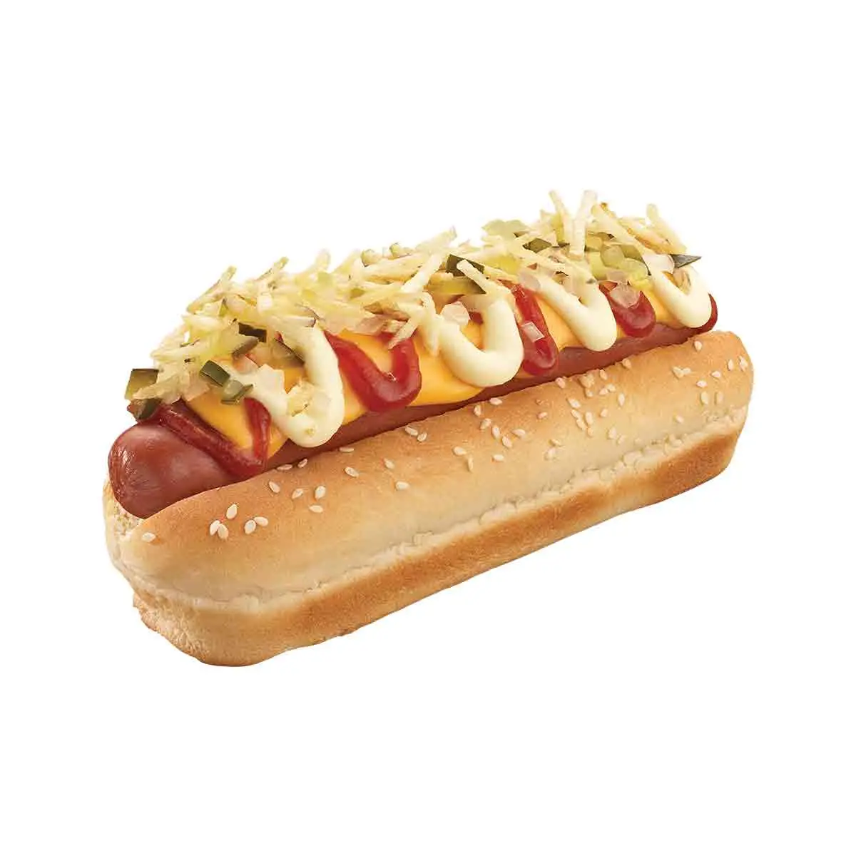 Salchicha americana, tajada de queso tipo cheddar, trocitos de pepinillos y cebolla con papa fosforito y salsas Presto y de tomate.