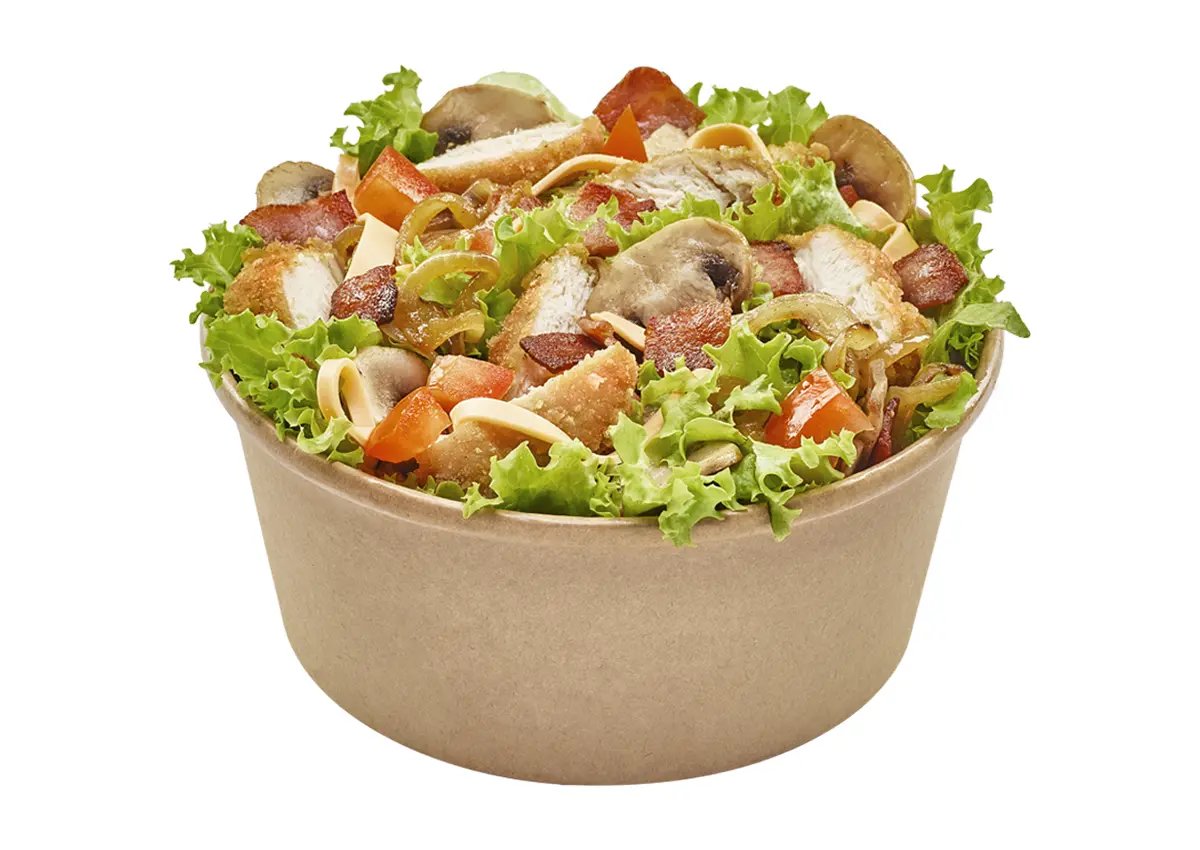 Con trozos de pollo apanado, lechuga crespa, cebolla grillé, champiñones salteados a la plancha, trozos de tomate, queso tipo cheddar, trocitos de tocineta y aderezo.