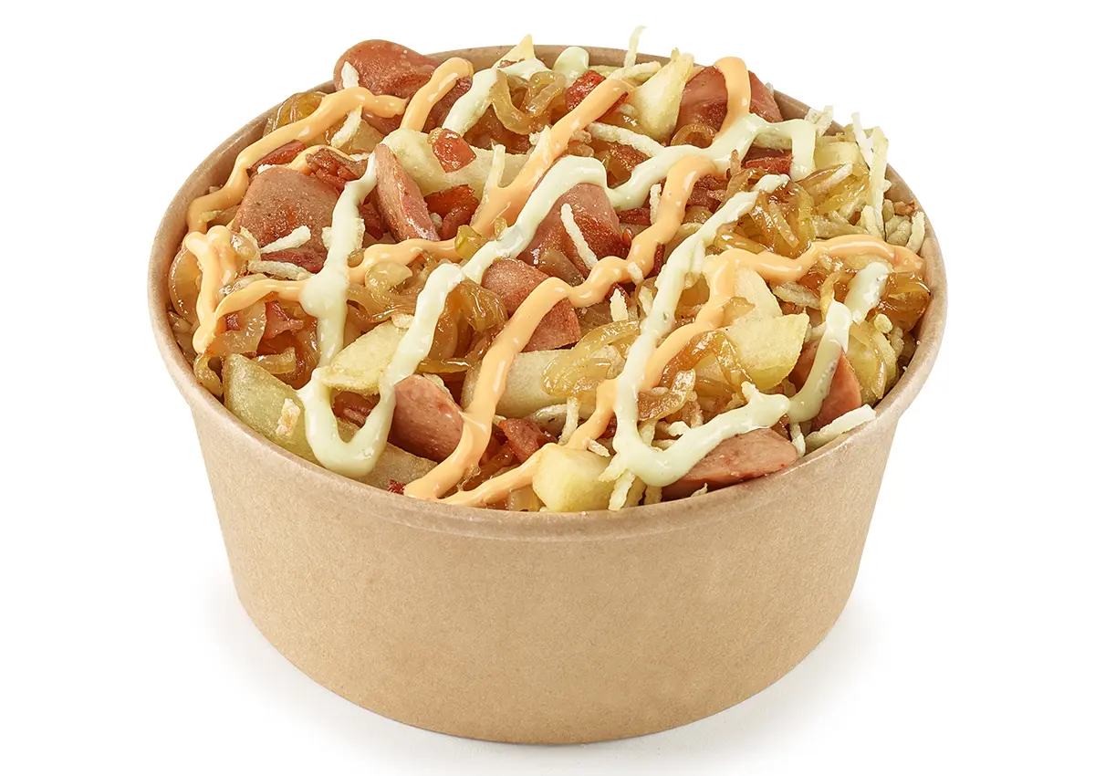 Papa a la francesa (143g), salchicha, 4 tiras de tocineta, cebolla grille, papa fosforito, aderezo tipo cheddar, salsa Presto y un toque de salsa BBQ