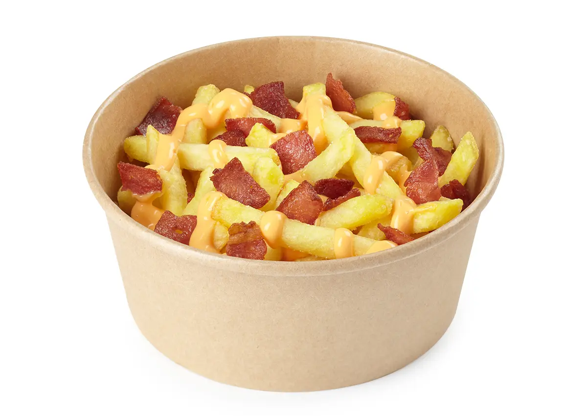 Papa a la francesa (200g), 2 tiras de tocineta crocante y aderezo tipo cheddar.